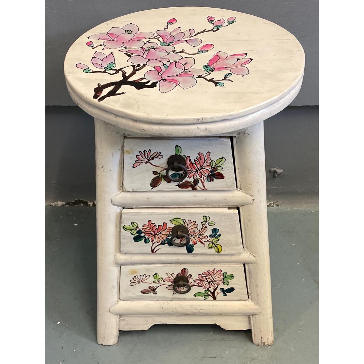 ORIENTAL decorative off-white traditional floral design lacquered white based stool/storage cabinet with three drawers - new still in wrappers! unused item in storage
