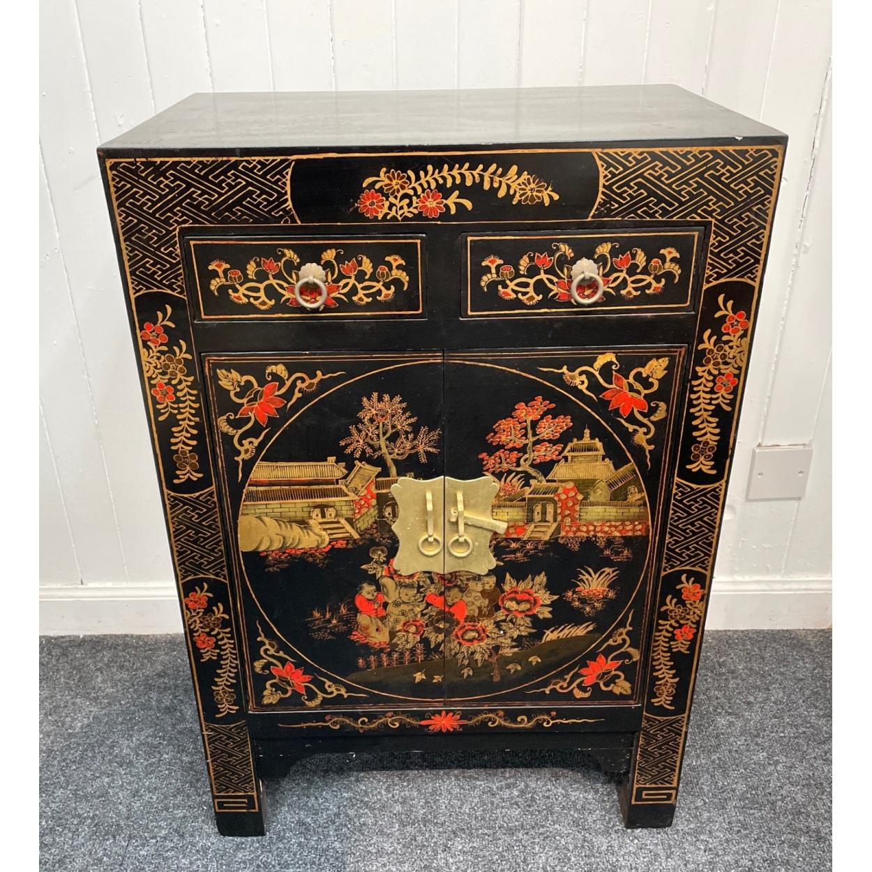 ORIENTAL decorative red and gold traditional design lacquered black based 2 door and two drawer side cabinet - unused item in storage
