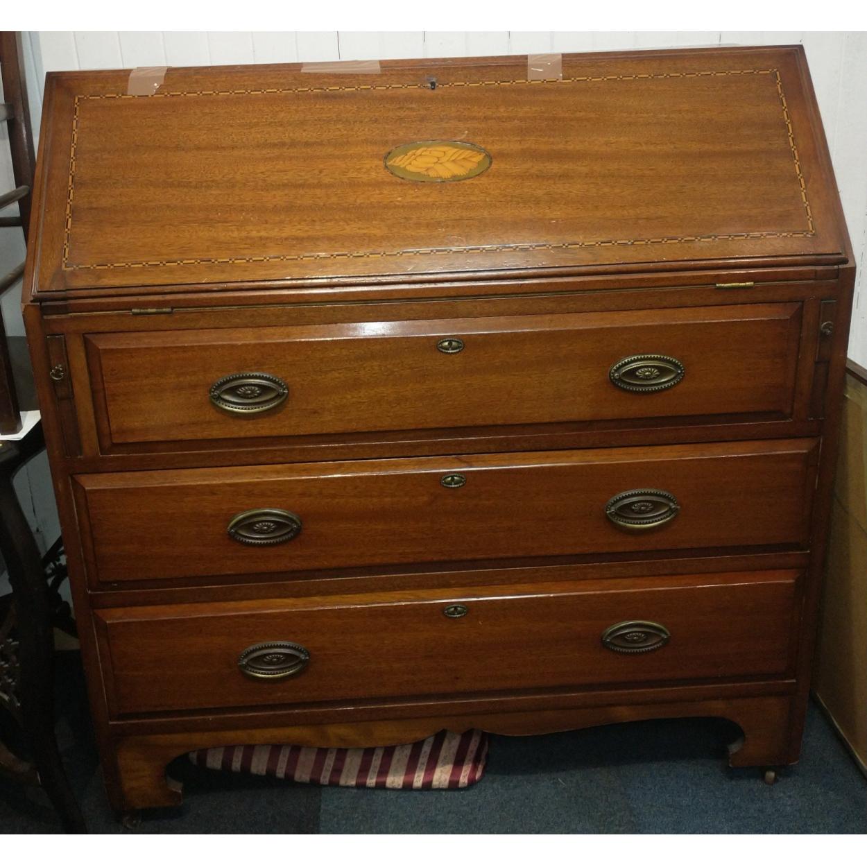 An EDWARDIAN bureau with shell motif, green leather writing pad and 3 drawers