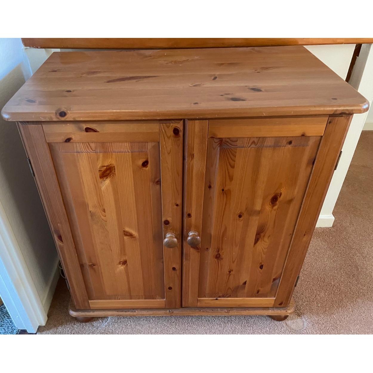 A two door pine cabinet with two doors and a storage shelf on bun feet - with a pull out shelf - dimensions length 80cm x 46cm depth x height 82cm approx