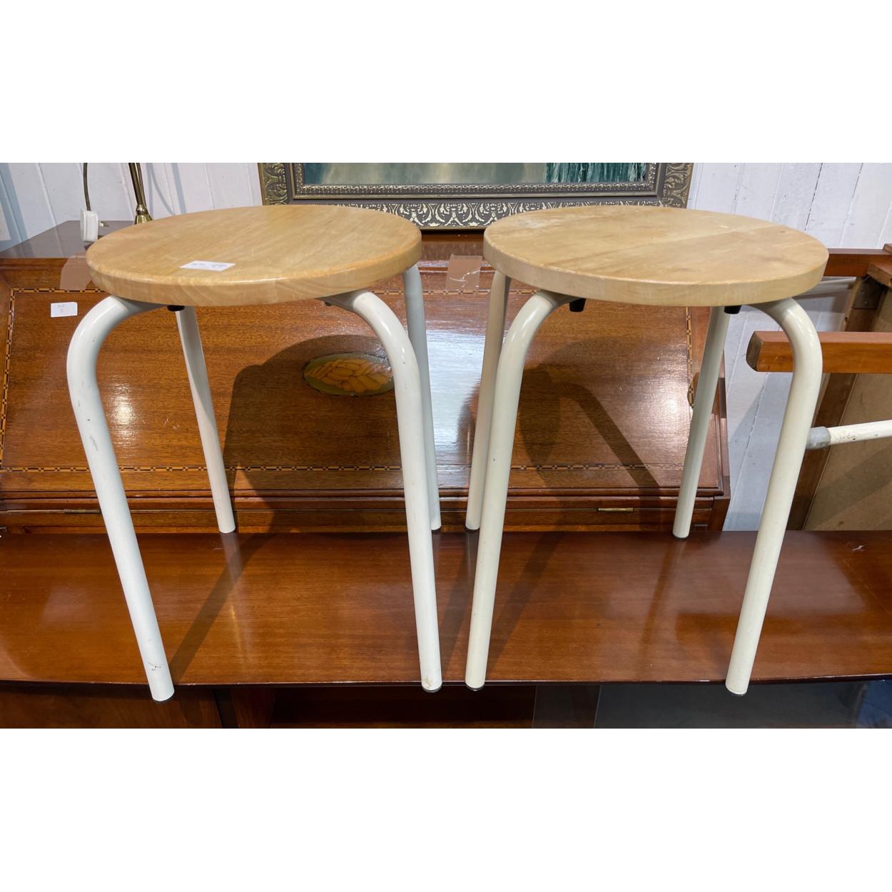 Two small pine topped kitchen stacking stools - 30cm diameter x 44cm height