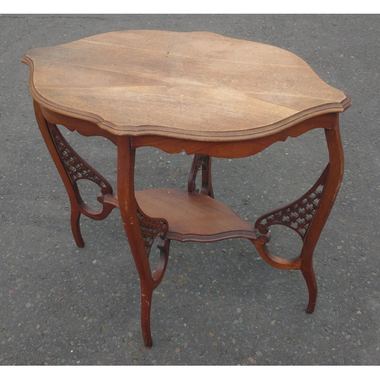 An ANTIQUE wooden 2 drawer side table with feature trim on drawers. W: 61cm D: 45cm H: 68cm approx