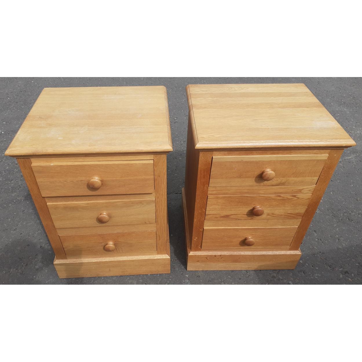 Two SUBSTANTIAL three drawer LIGHT OAK wood bedside cabinets in good condition. 73cm x 40cm.