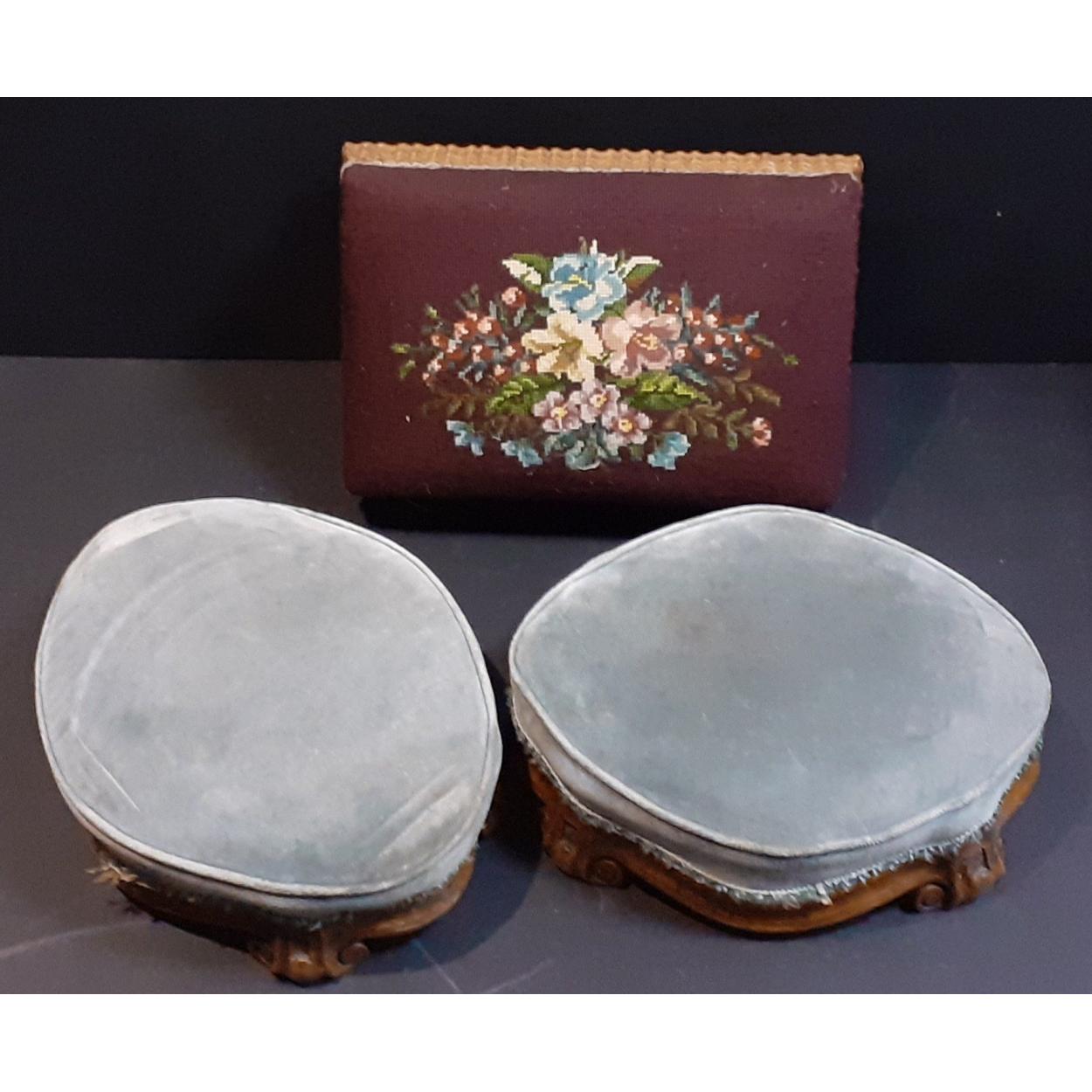 Three antique footstools, comprising two matched scrolled carved matching ones and one other with embroidered cover.