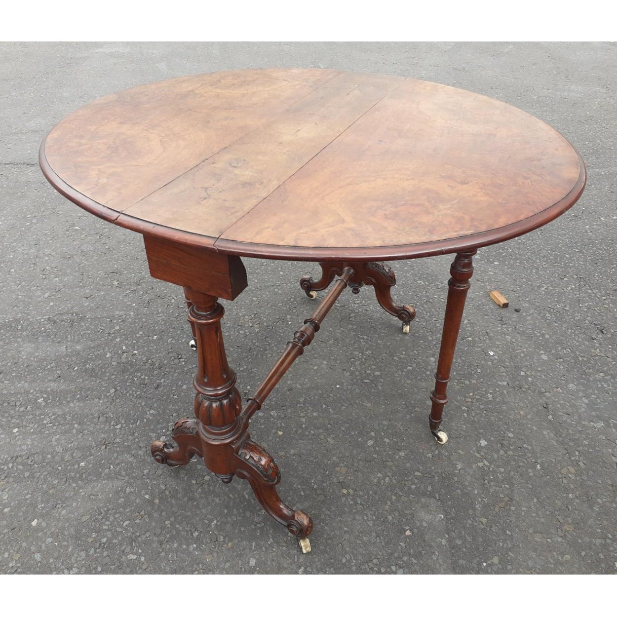 A mid-Victorian mahogany circular folding gate-leg tea table with stretchered leg supports with original porcelain castors - dimension when extended 120cm diameter - 25cm width when folded down against the wall!