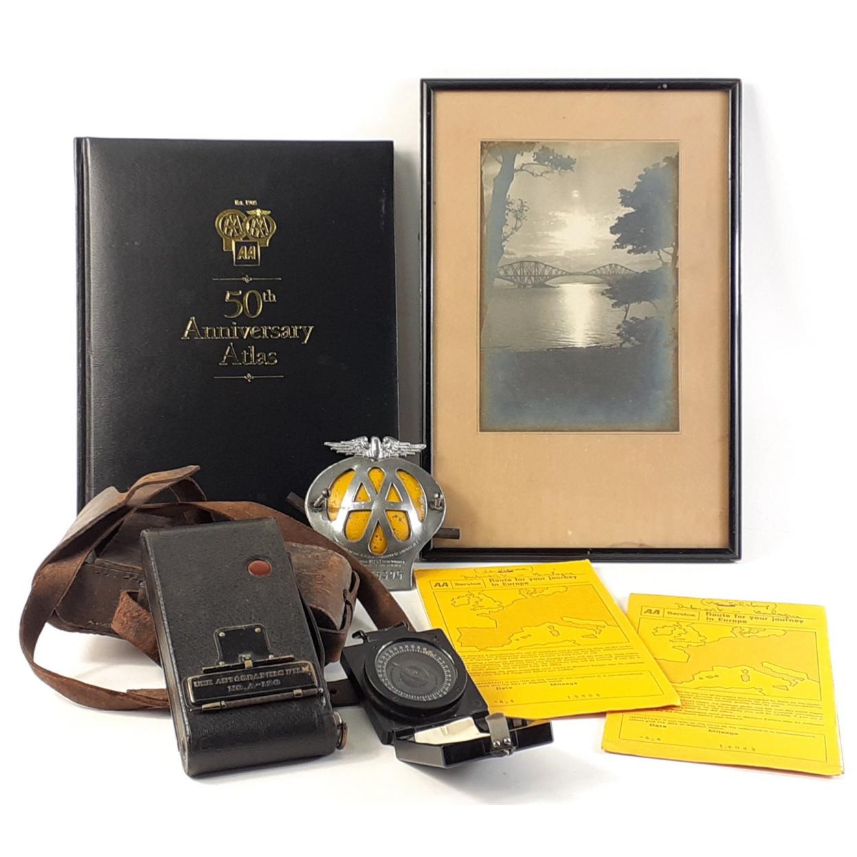 A vintage AA badge (0975395) with 2 AA Service 'Route for Your Journey in Europe' - Dubrovnik - Boulogne via Salzburg and Vienna, an AA 50th anniversary atlas, a vintage magnetic marching compass, a No 2 folding autographic brownie in leather case and a 100 year old photo of The Forth Bridge at sunset (frame measures 34 x 23cm approx)