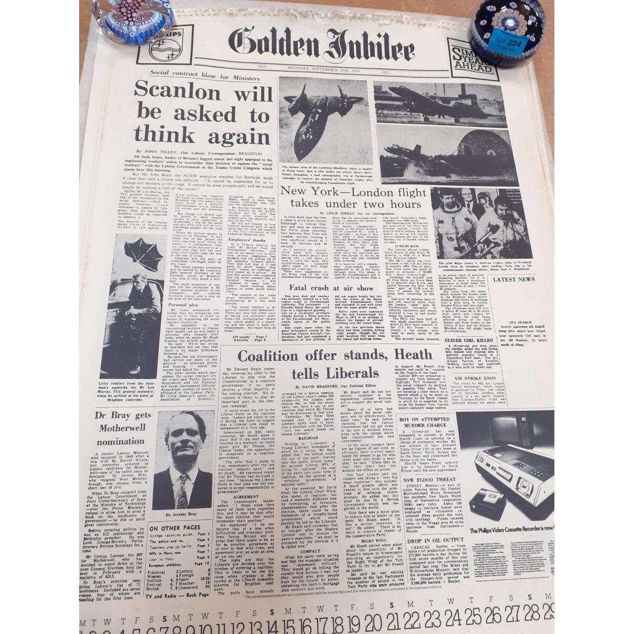 Several large calendar pages of re-printed front page news items