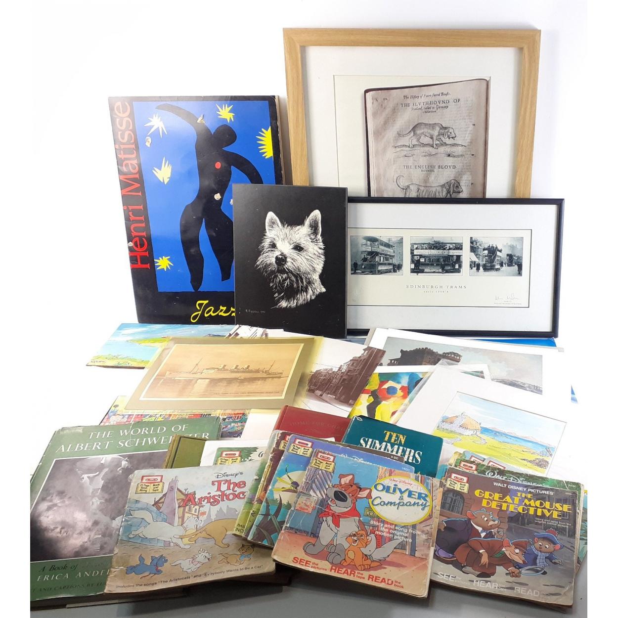 Interesting framed and unframed prints, booklets and ephemera lot to include a folder of MATISSE prints, colourful EDINBURGH Grassmarket print, DISNEY prints