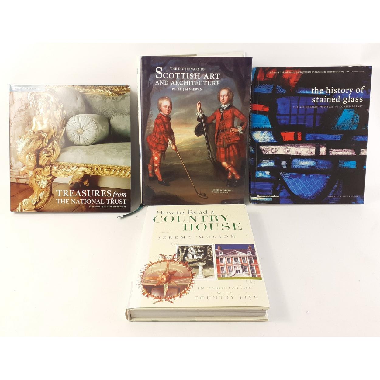 Four books of art and craft interest to include THE DICTIONARY OF SCOTTISH ART AND ARCHITECTURE by Peter JM McEwan, THE HISTORY OF STAINED GLASS by Virginia Chieffo Raguin, HOW TO READ A COUNTRY HOUSE by Jeremy Musson, and TREASURES FROM THE NATIONAL TRUST