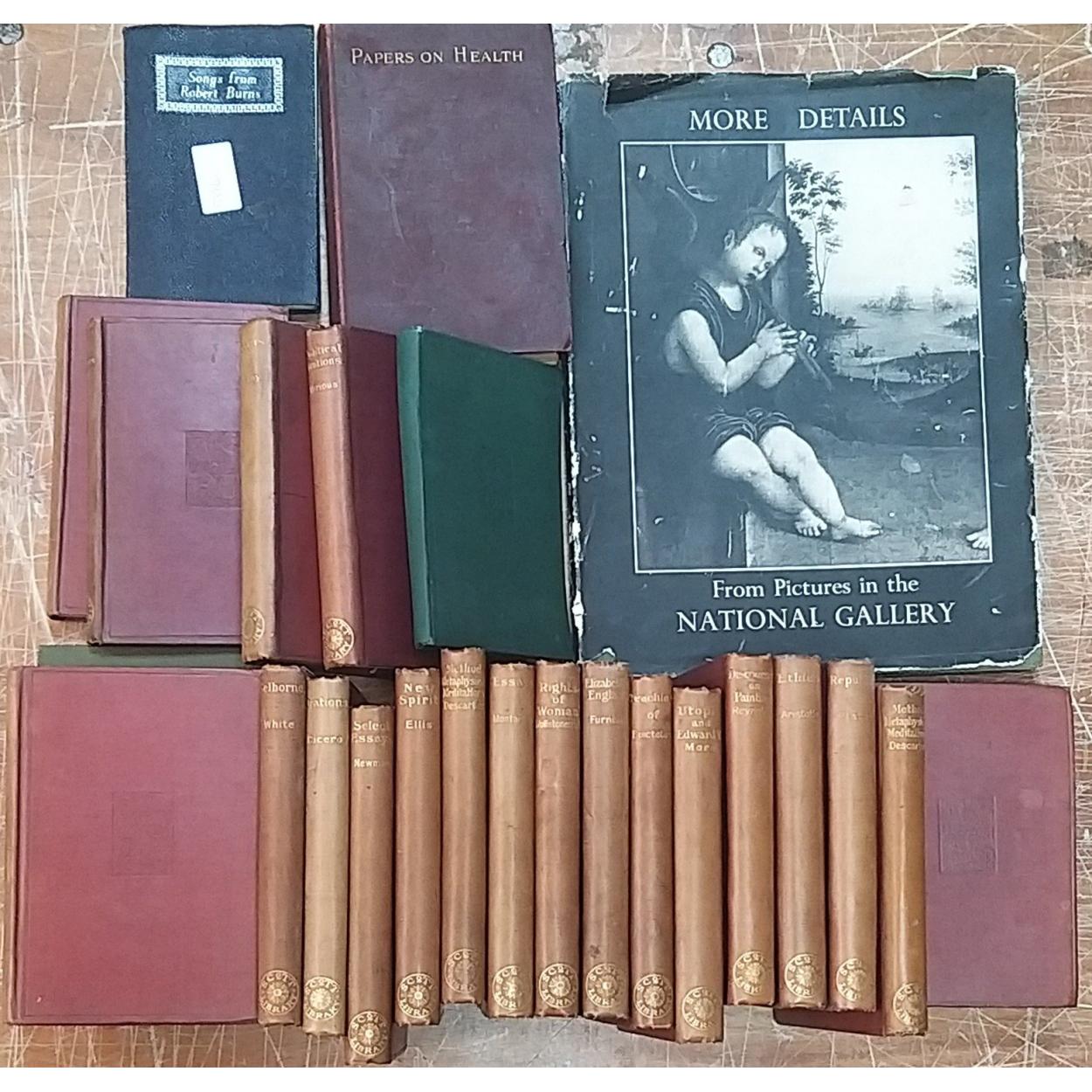 Twenty three volumes of THE SCOTT LIBRARY to include My Study Windows by James Russell Lowell, Select Essays of John Henry Cardinal Newman, Oration by Cicero, On Liberty by John Stuart Mill etc. Published by Walter Scott, London, cloth and board covers in fair condition. Plus others