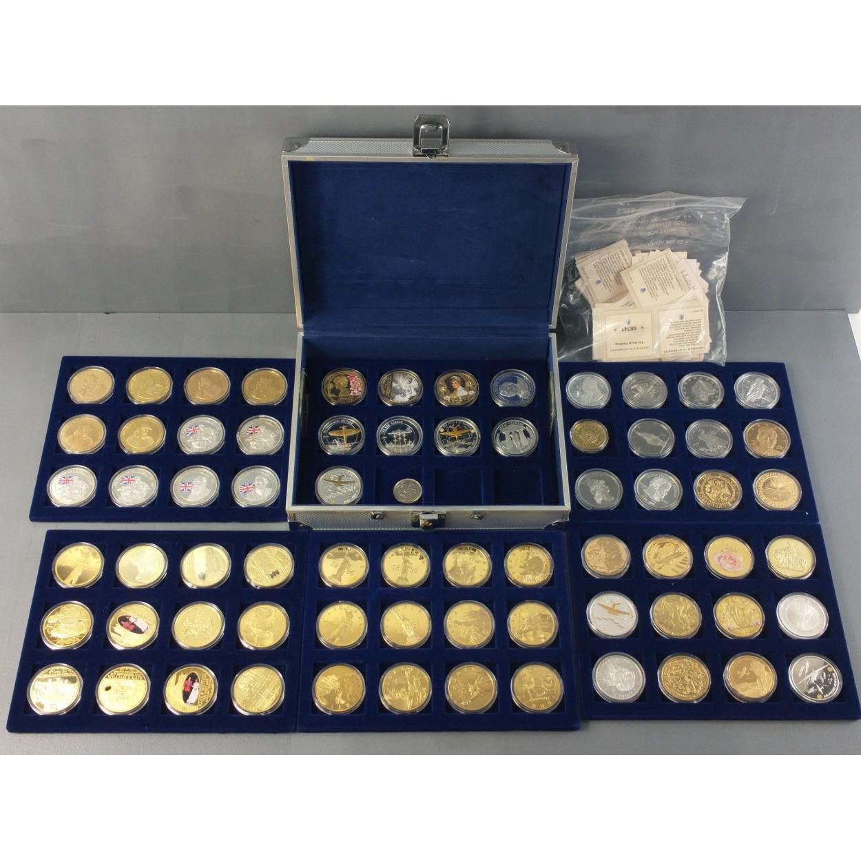 A case containing many CU goldplated collectors coins. Royal commemorative, United States etc. Over 60 individually encapsulated coins. A super collection with loose certificates.