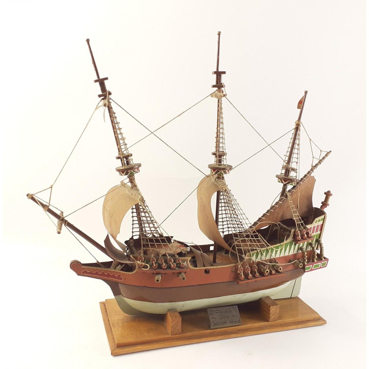Model of a galleon, Drake's Golden Hind. Width 42cm approx. A little sympathetic tidying up required to sails.