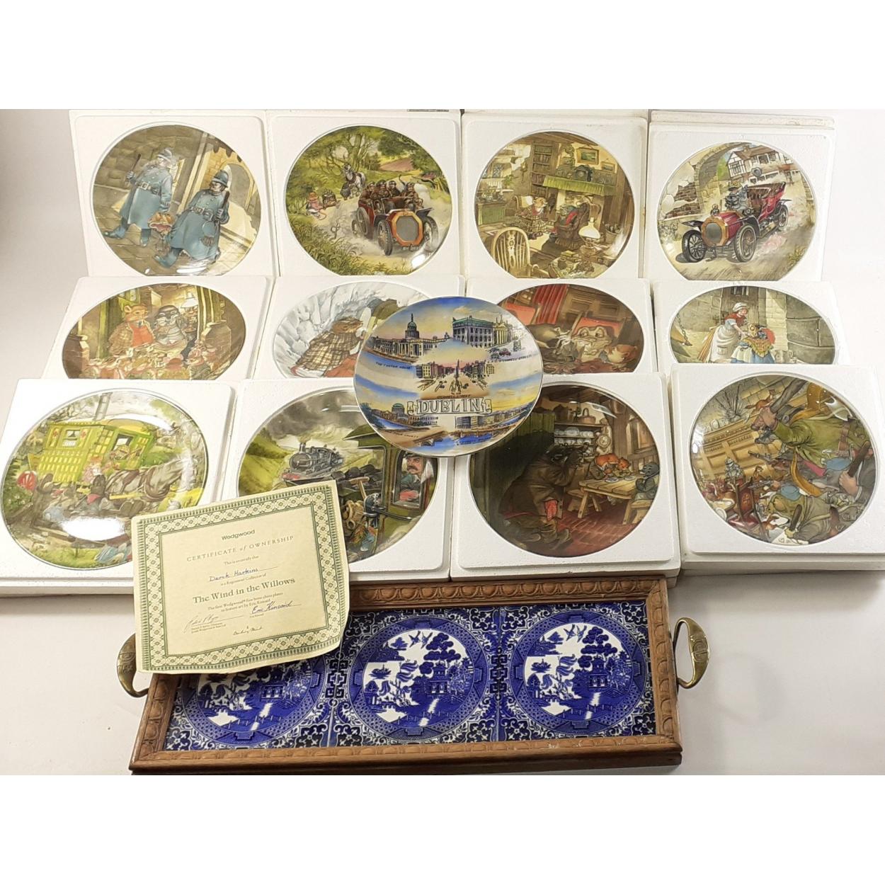A mixed ceramic lot to include 12 WEDGWOOD 8 inch plates from the WIND IN THE WILLOWS series with art by Eric Kincaid and also a tray formed from 3 blue and white Oriental style tiles (50 x 19cm approx),