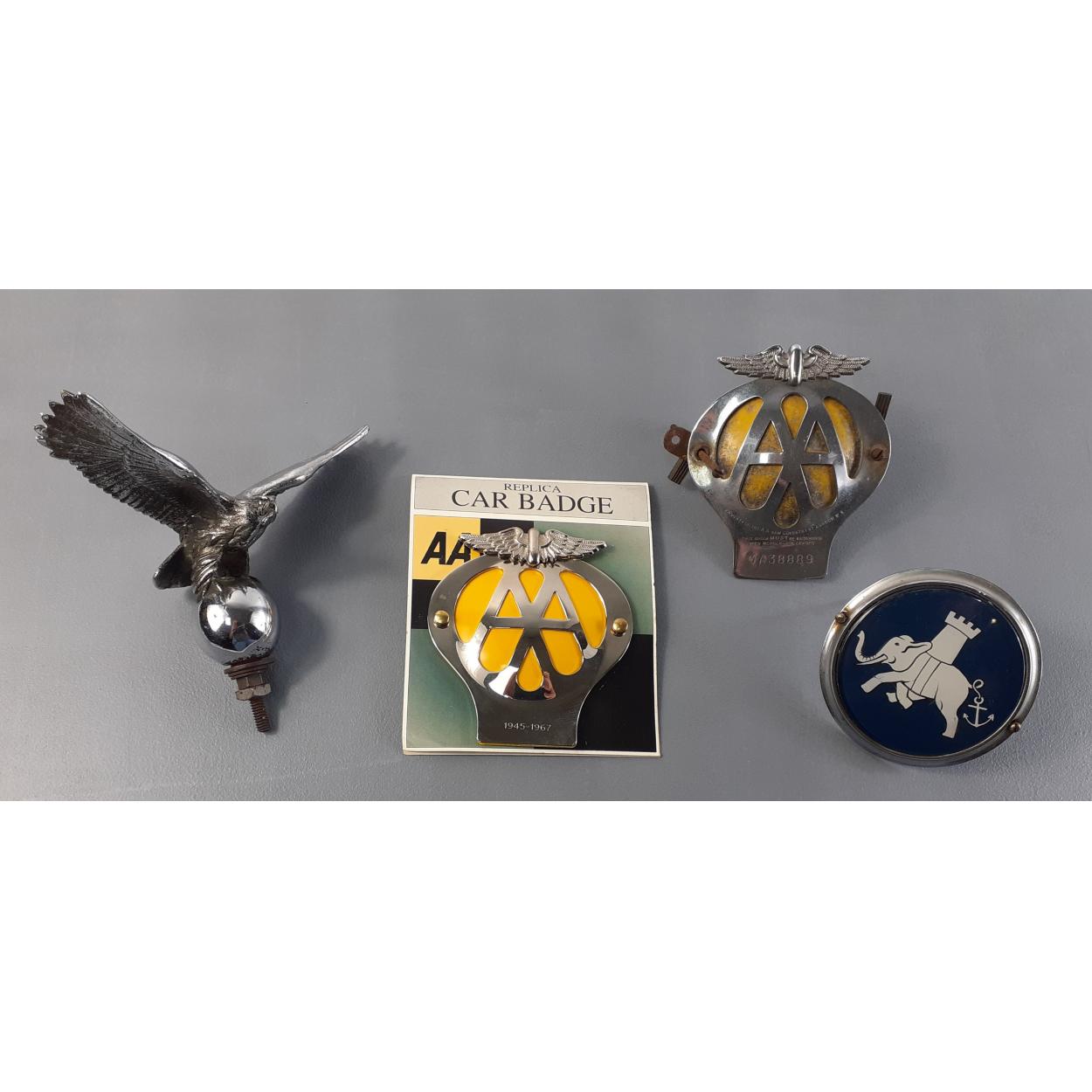 A superbly sculpted Spreadeagle car mascot with a 16cm wing span, an AA badge with a replica and one other. A nice collection.