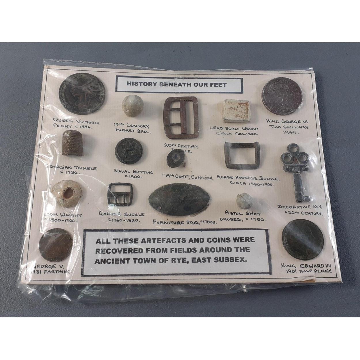 An interesting little collection mounted on board of DUG / FOUND items from around RYE in East Sussex. Musket ball, thimble, key, coins etc. A nice little lot of interesting items.
