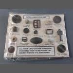 An interesting little collection mounted on board of DUG / FOUND items from around RYE in East Sussex. Musket ball, thimble, key, coins etc. A nice little lot of interesting items.