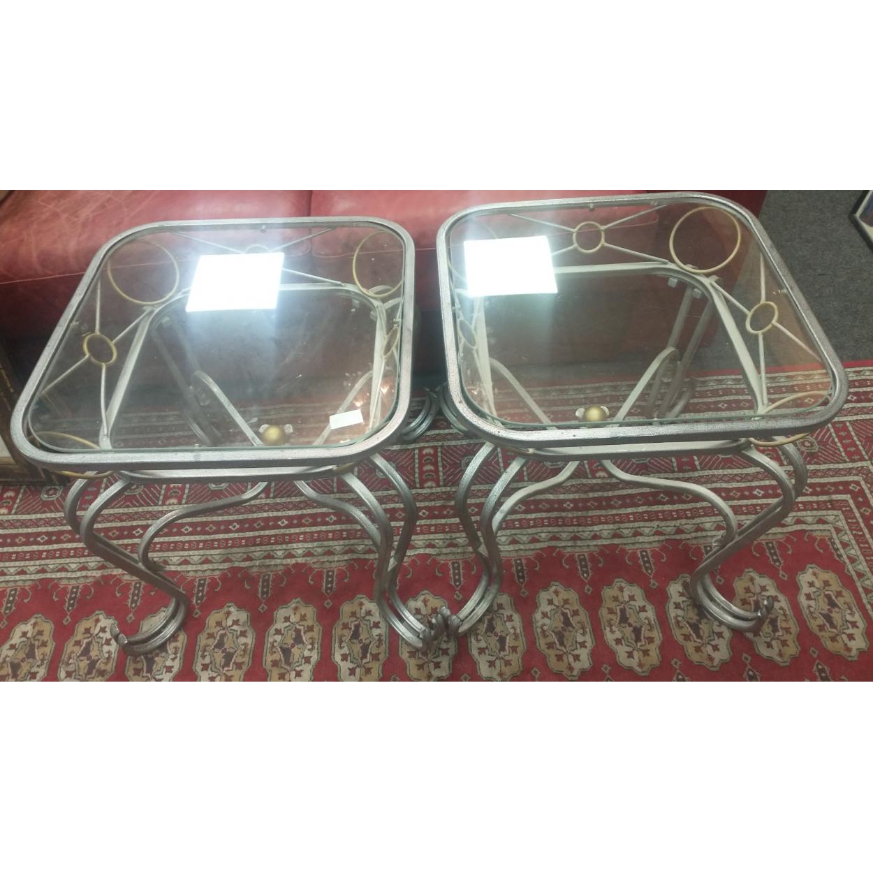 Pair of square glass topped side tables with scrolling metal arms. W(at feet): 52cm W(table top): 48cm H: 51cm approx