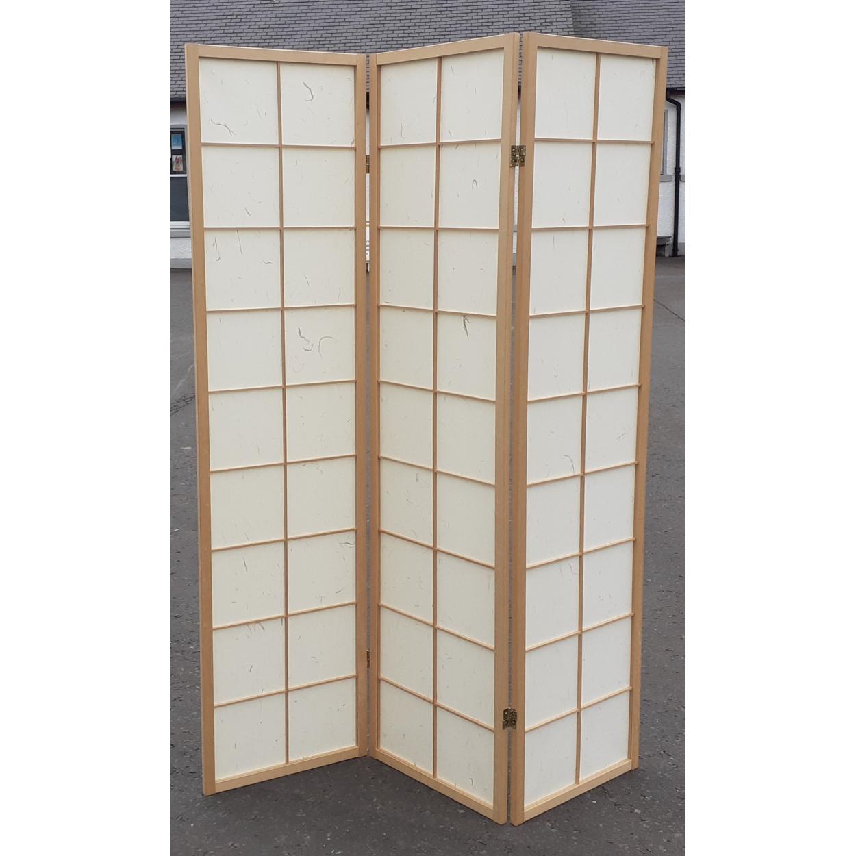 A three panel paper screen room divider in a light wood frame measures L137 x H190cm approx