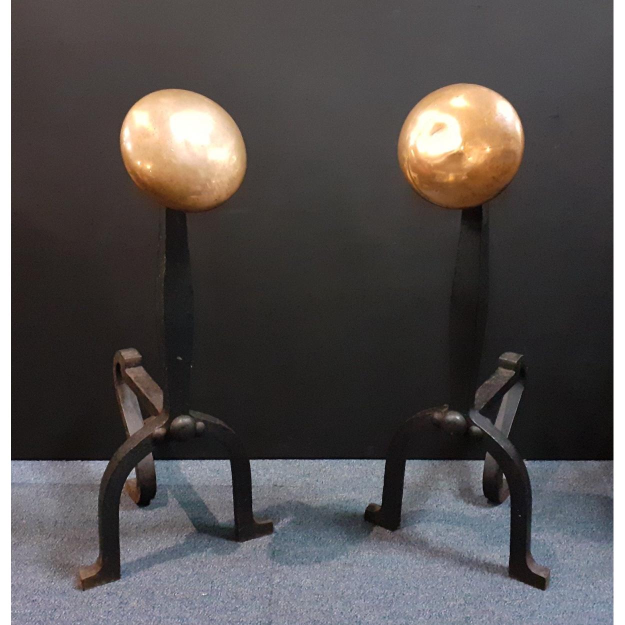 A superb pair of antique Arts and Crafts style wrought Iron Andirons / Fire Dogs with copper button finials. Stand 63cm tall approx.