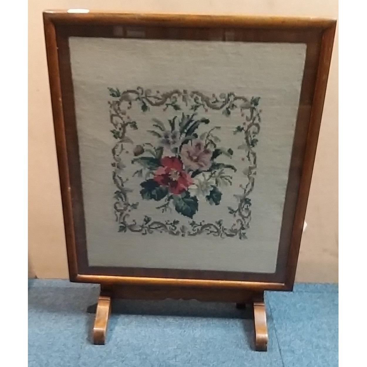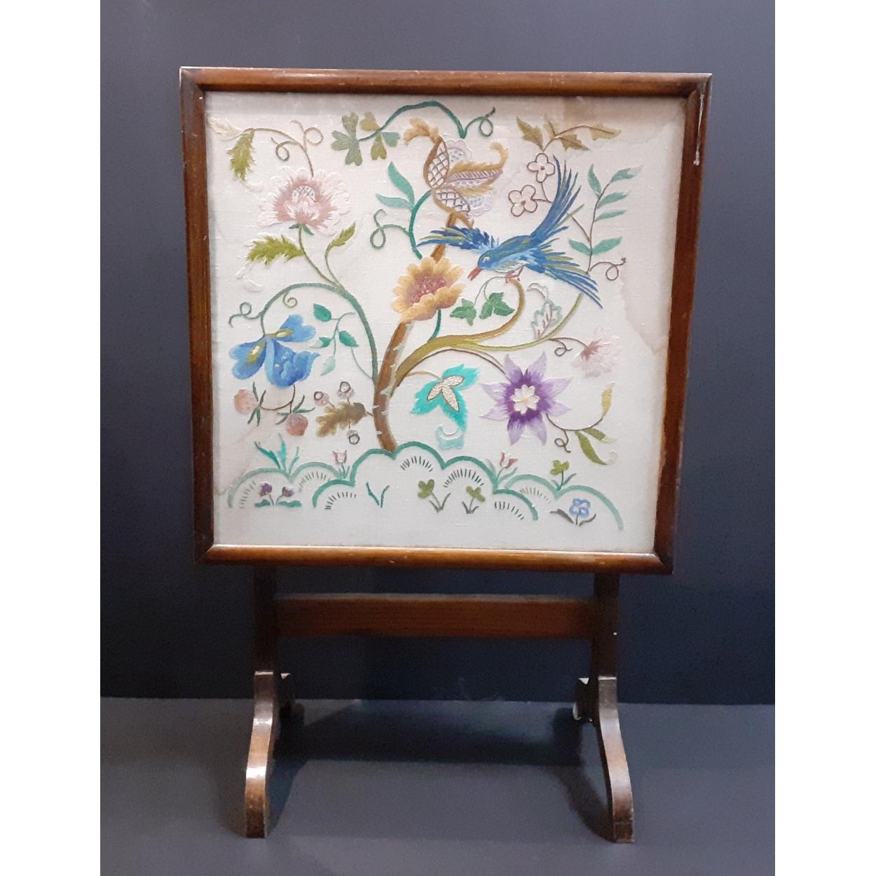 A folding c1930's embroidered firescreen and table with glass front - dimensions 50cm square top x 54cm height approx