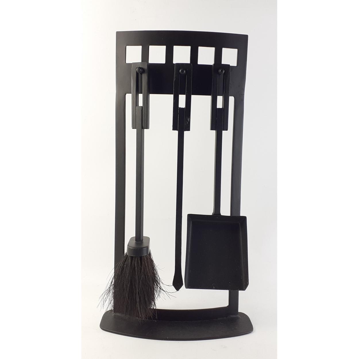 A fireside set comprising coal scuttle, log holder, and small shovel plus fire guard 70cm wide approx