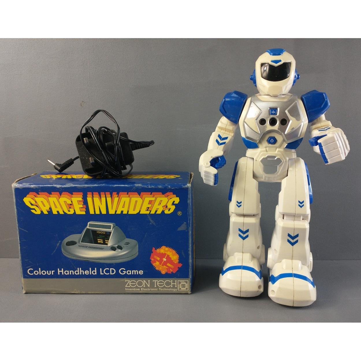 Vintage Space invaders game and a battery robot.
