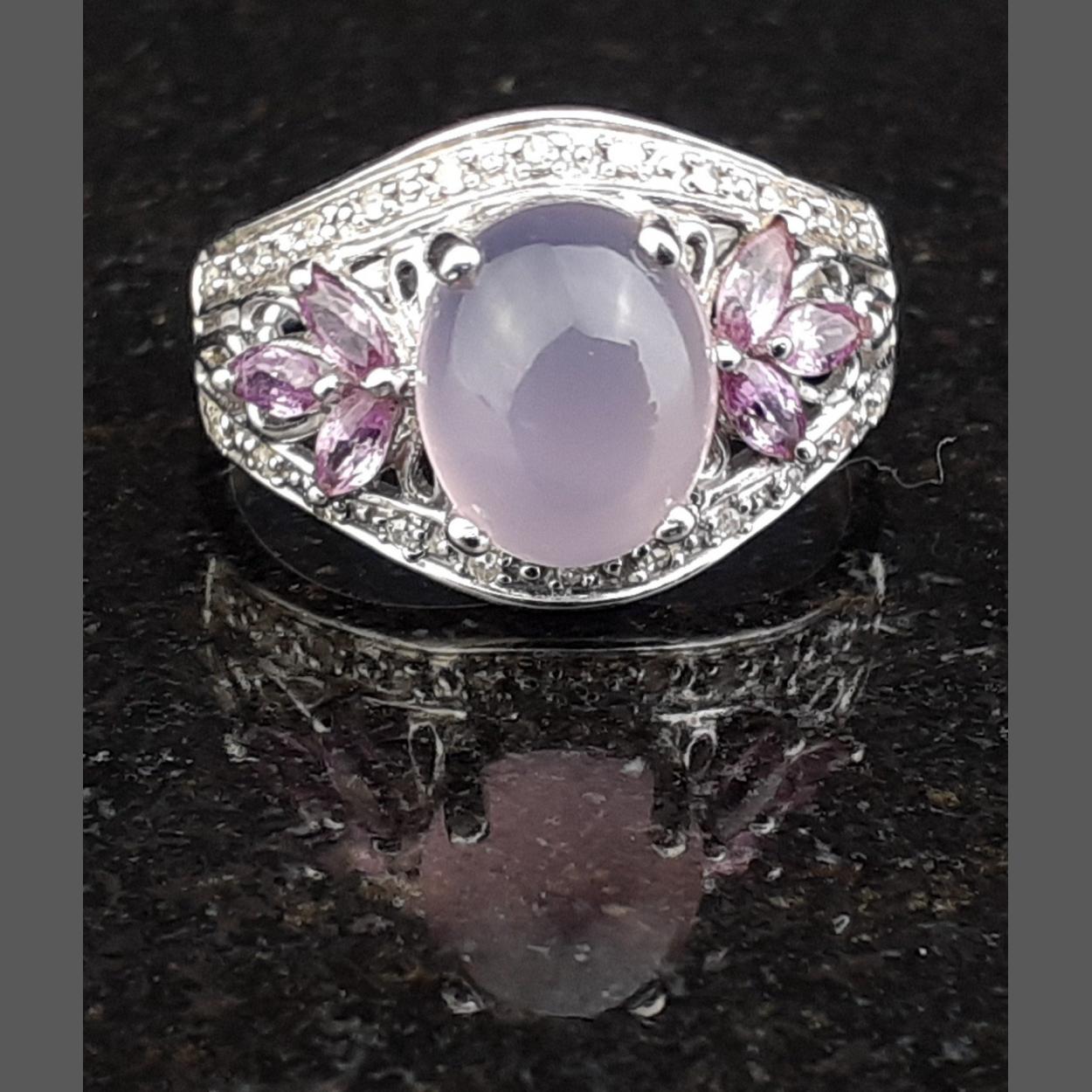 A ladies dress ring stamped 9K set with 9 lilac stones. Size Q, gross weight 3.07g approx