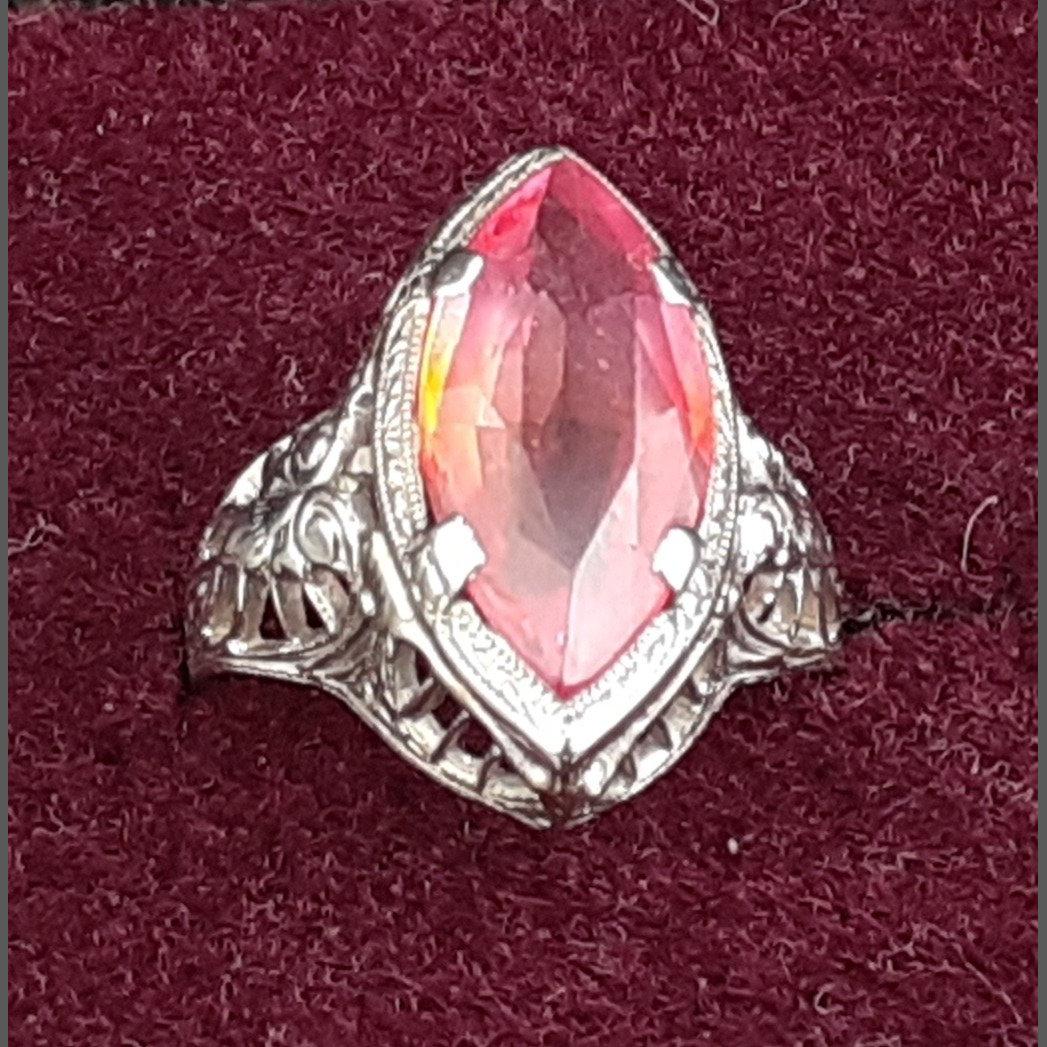 A 10K stamped ring set with a large pink stone (15mm long approx) and openwork shoulders. Size I, gross weight 2.96g approx