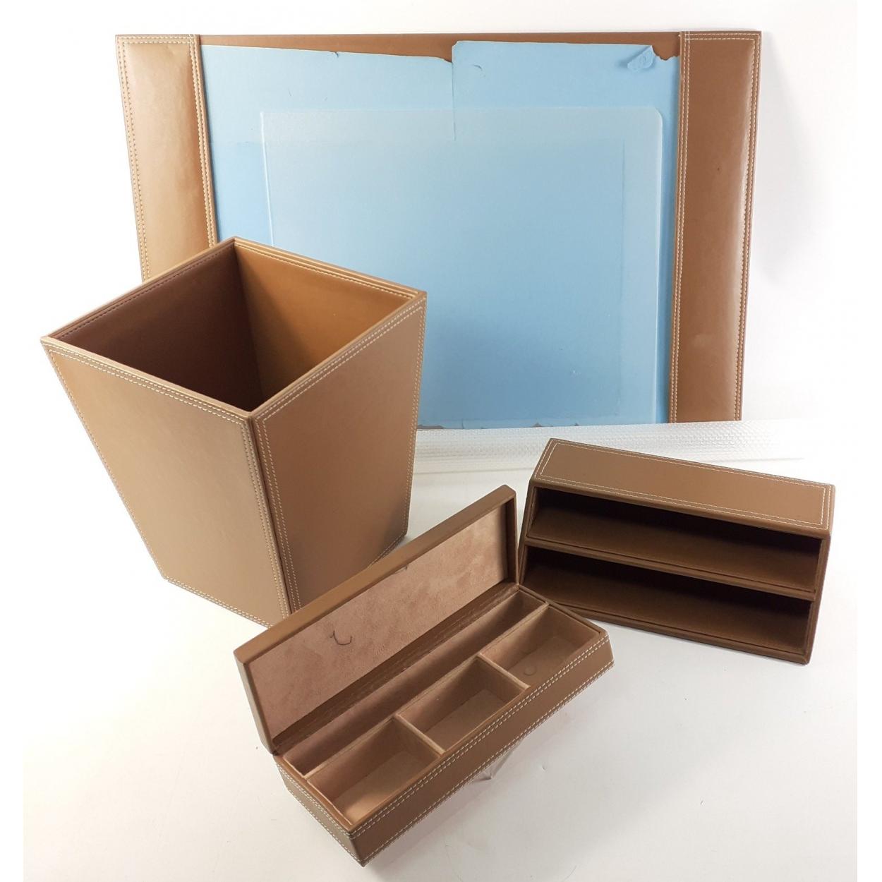 An attractive leatherette desk set comprising letter rack, storage box, waste bin, blotting pad