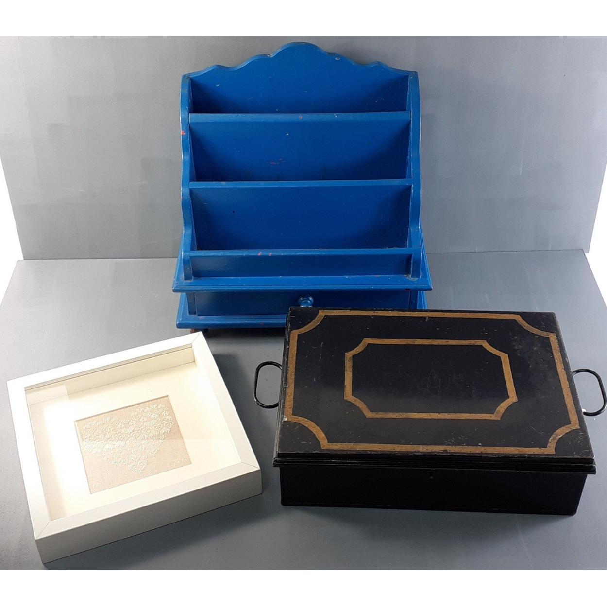 Desk tidy with drawer painted blue and a black lockbox with original key. Desk tidy approx 35cm wide, 22cm deep and 32cm tall approx. Plus, a framed embroidered heart