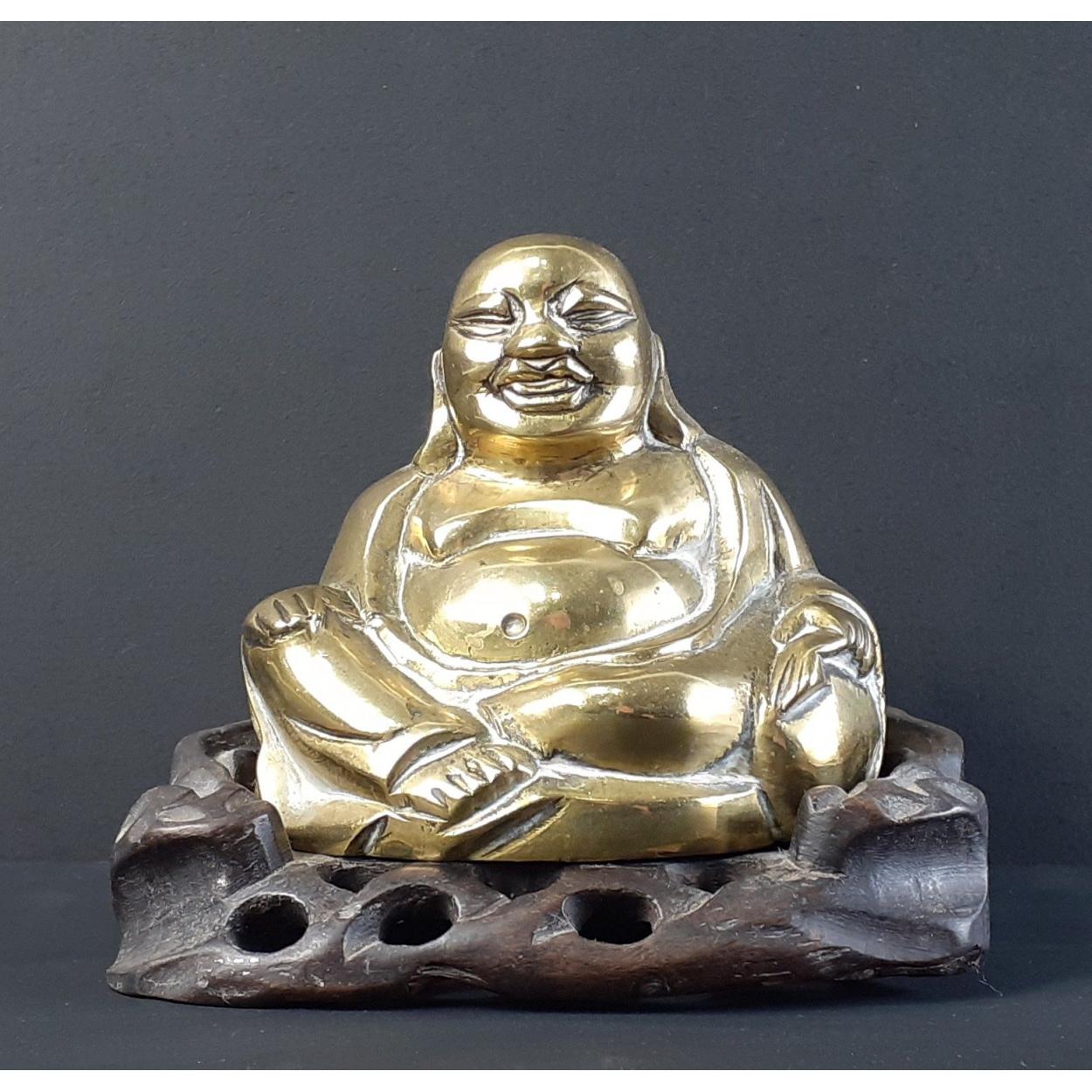 A brass sitting Buddha on a wooden plinth, stands 10cm tall approx