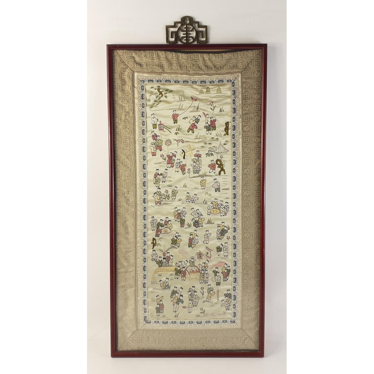 An embroidered silk Chinese framed picture with multiple scenes of children. Frame size 68 x 33cm approx