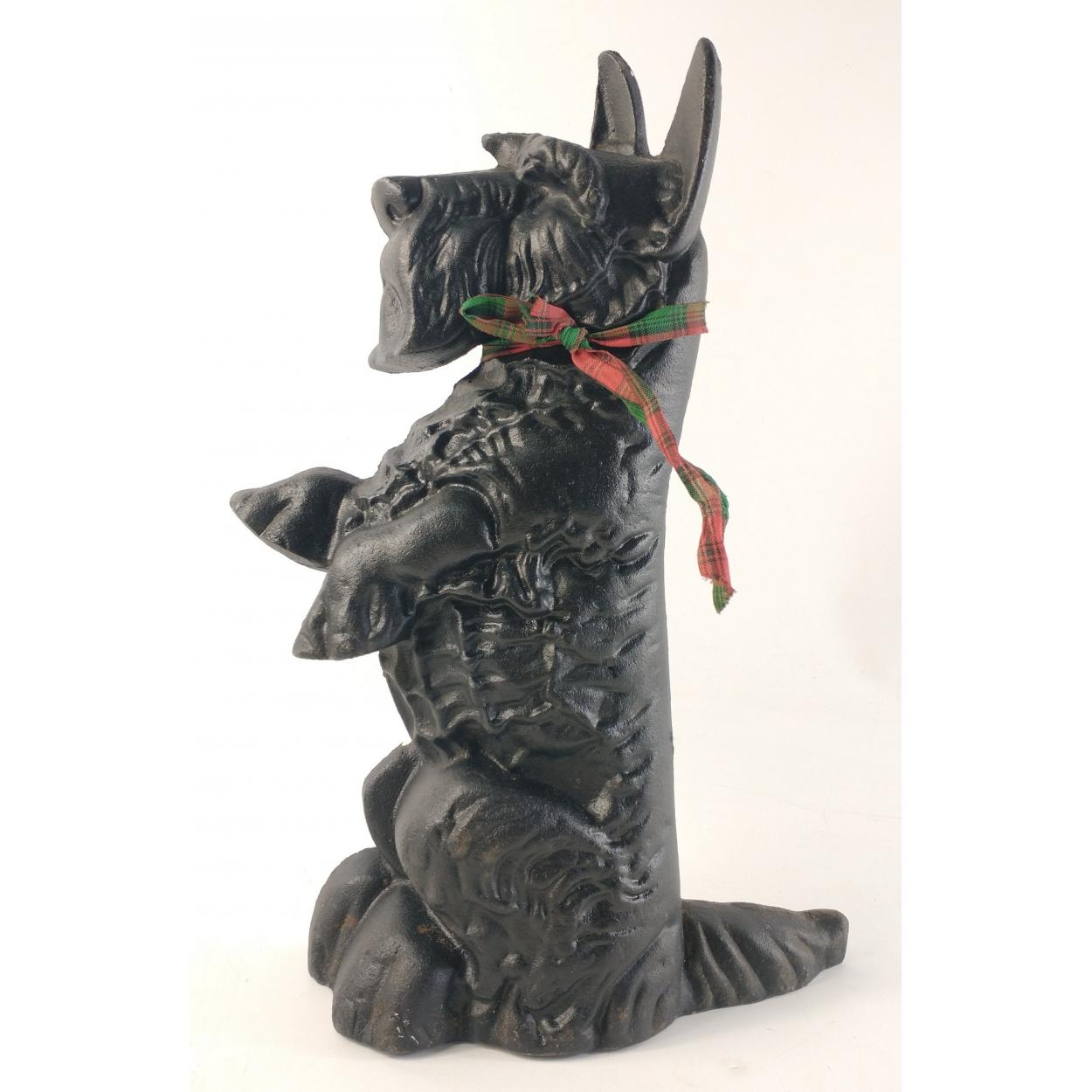 WOOF! A heavy pretty and fun cast iron SCOTTIE DOG door stop standing 37cm tall approx with a cute wee tartan neck tie.