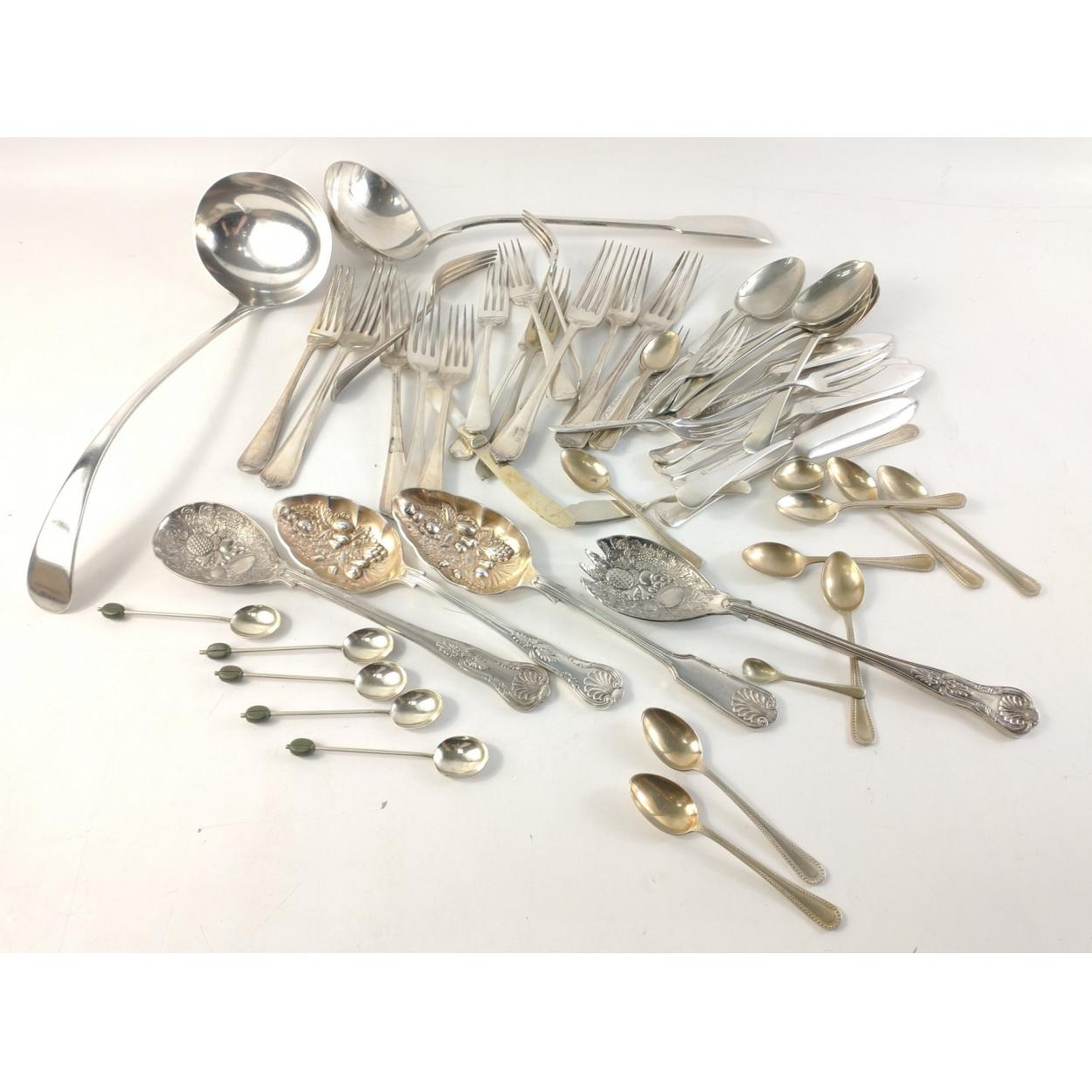 A small lot of silver plated flatware to include two ladles, some Queen's pattern and other flatware.