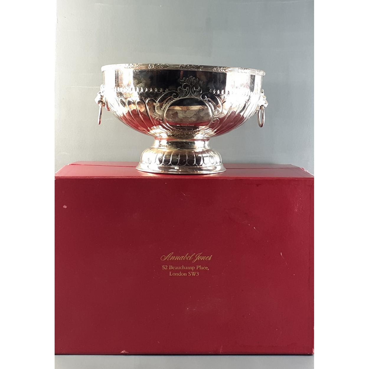 A Knock-Out oversize presentation PUNCH BOWL. Amazing piece with elaborate design and Lions Head handles. 32cm diameter. 1994 presentation inscription. In Annabel Jones of London box.