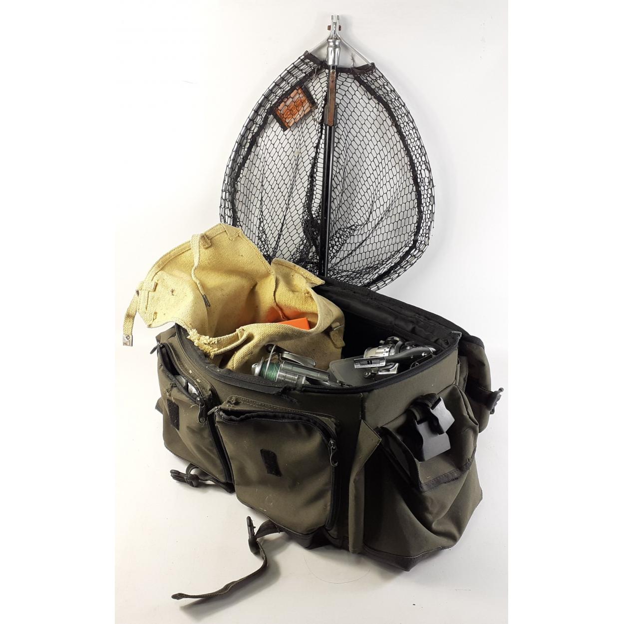 WYCHWOOD fishing tackle bag with contents to include OKUMA interceptor spinning reel, KRONOS XL30 reel SHAKESPEARE reel, landing net and other fishing accessories.