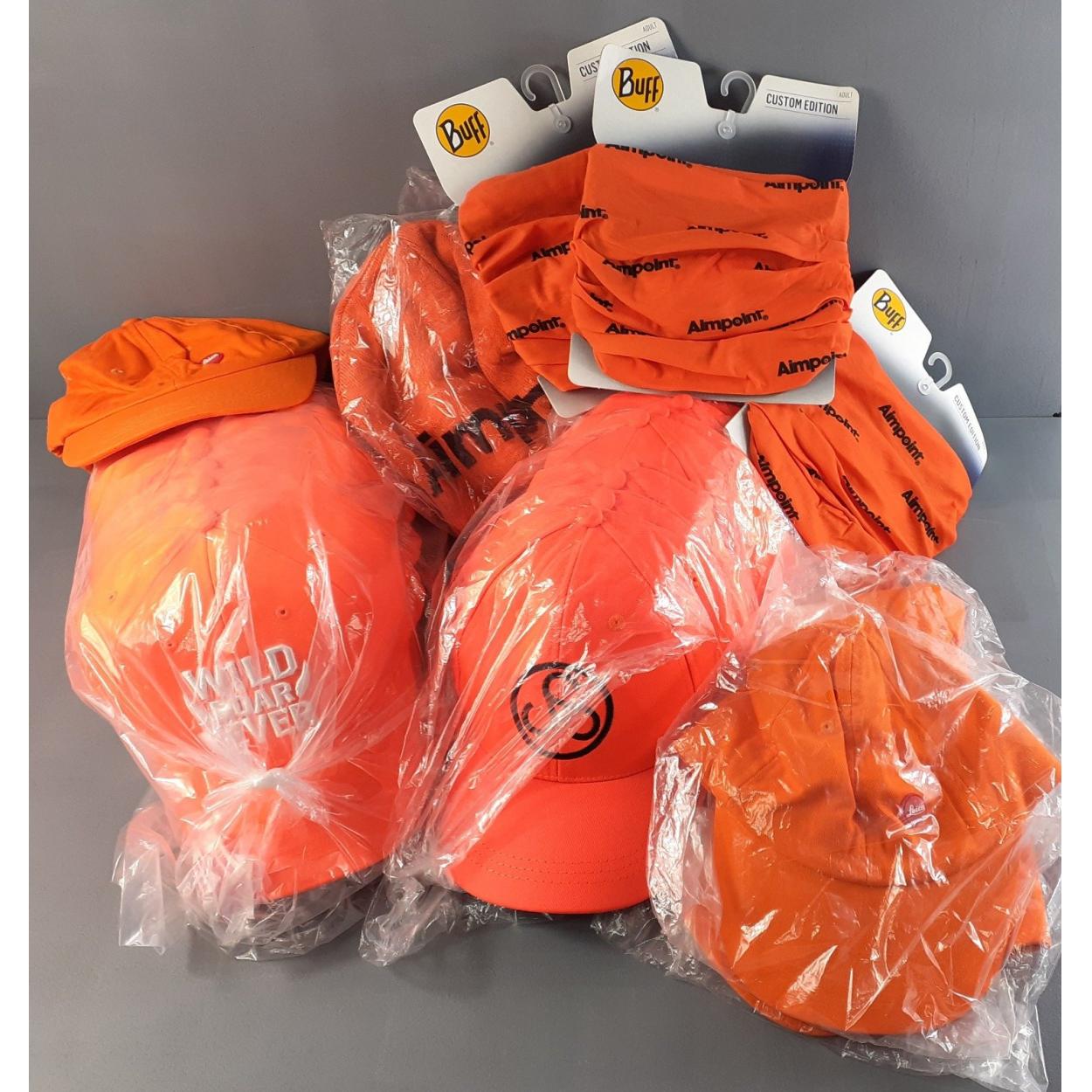 HUNTING INTEREST! Brand new hunting interest high visibility good quality wear, comprising WILD BOAR caps, LEICA caps, SAUER caps and others. All in DAYGLO orange.