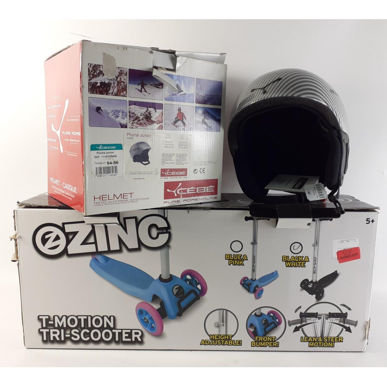 An OZINC T-Motion Tri Scooter in box. Comes with a Pluma Junior cycle helmet size 54-56, with tags in box.