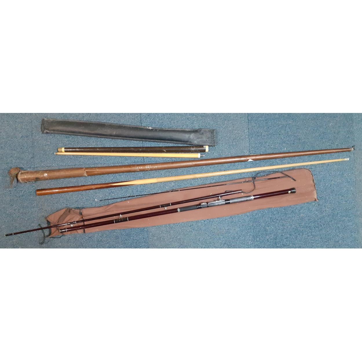 Two snooker cues, one in tin holder and a three piece rod in case.