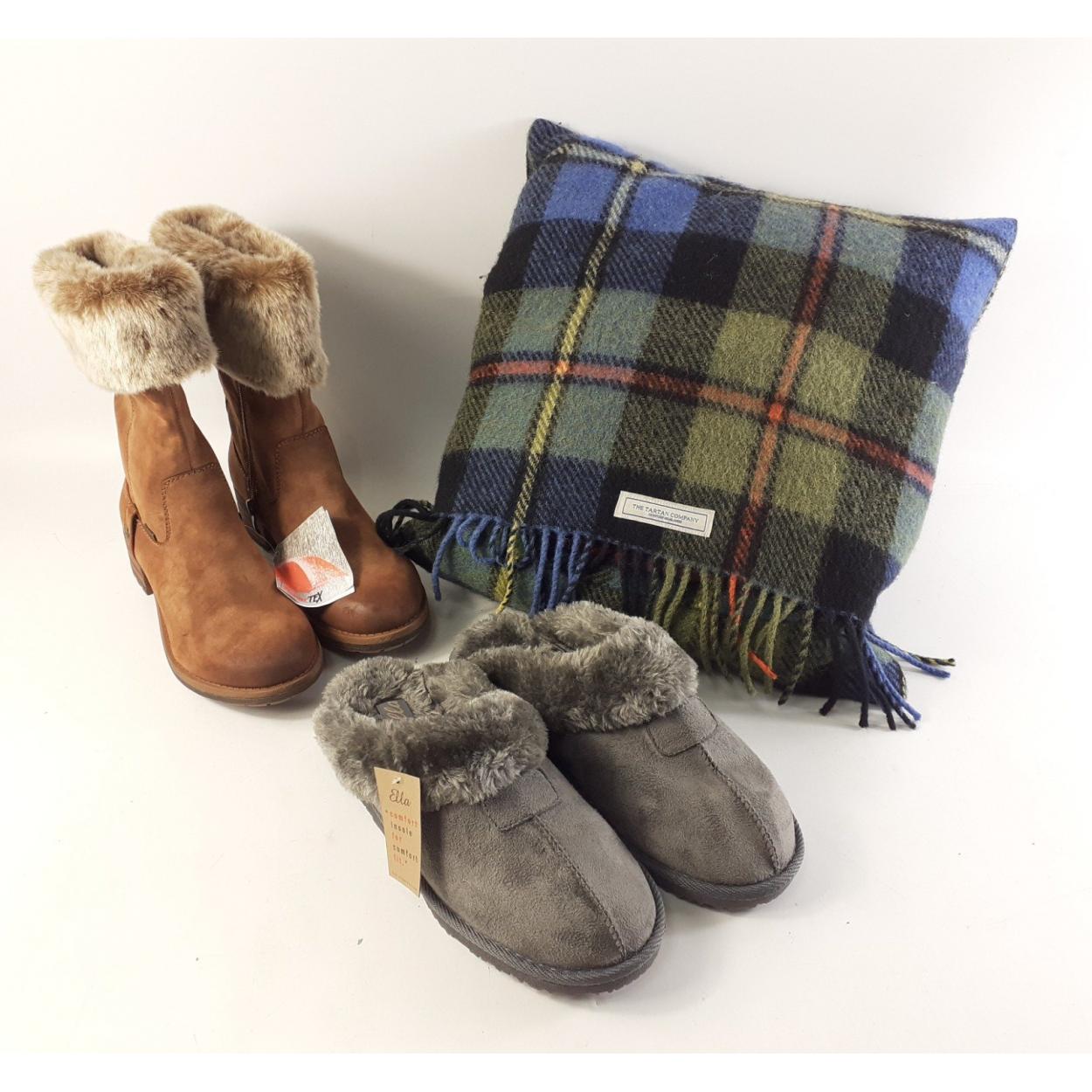 A tartan cushion with a pair of Ladies RIEKER ankle boots brand new with tags size 38, and a pair of slippers, again new with tags.