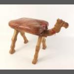 A child's camel footstool with padded leather seat with embossed head of Nefertiti. L36cm approx. Some damage.