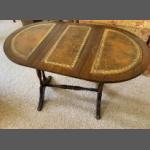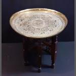 An attractive Benares brass tray (58cm dia. approx) set on folding wooden legs with inlaid mother of pearl.