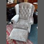 A VICTORIAN plush wooden armchair with attractive deep buttoned gold fabric. Nicely carved top finial.