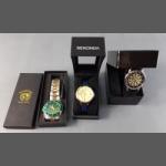 CAMROSE & KROSS. Pretty gilt replica Jacqueline Kennedy collection three band bracelet set with purple stones with flexible bracelet and CoA