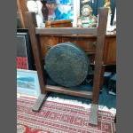 A substantial and impressive dinner gong mounted on solid wooden frame. 116cm tall on the frame and the gong itself is 55cm diameter. Comes with a high quality Chaklin beater. A superior piece.