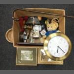 A mixed box to include a small LIMOGES trinket box, a Kilmarnock FC supporting teddy bear, a rubber carving in a glass cage (one pane damaged), various items of Royal commemorative ware, Lady of the Dragons Mountain Sorceress, Land of Myth's small Pegasus B, 2 dog bowls, LP - Nat King Cole at the Sands, LP - Molly Weir Down Memory Lane, costume jewellery including a necklace and bracelet set, a small black wooden fan (needs repair), a kitchen clock, a walking stick 87cm long)