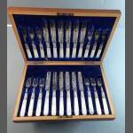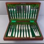 A wonderful WALKER & HALL cutlery canteen box with six W&H plated knives and forks and additionally six silver collared dessert knives and forks with plated blades and mother of pearl handles. Box carries a Walker & Hall label