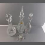 One crystal and two cut-glass decanters and a pair of knife rests. Tallest decanter 39cm approx