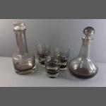 A retro smoky glass water set to include a lovely decanter with stopper, a carafe and 6 glasses (2 with minor nibbles)