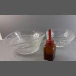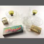 A glassware collection to include a Pyrex flan dish, 5 crystal bowls, crystal raised pie dish, 5th Avenue column lead candlestick, and others